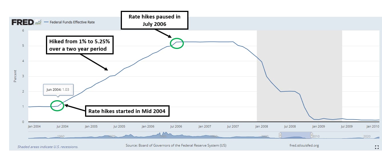 Responding to a heating up housing sector and inflation rates in mid-2004, the US Fed started increasing rates.