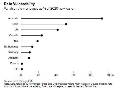 According to a May report from Fitch Ratings, Australia, Spain, the UK, and Canada had the highest variable-rate loans as a share of new originations in 2020.