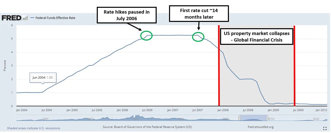 Problems in the US property market had started to become obvious, and by the time the US Fed started cutting rates, the bubble had burst, snowballing into a worldwide financial crisis.
