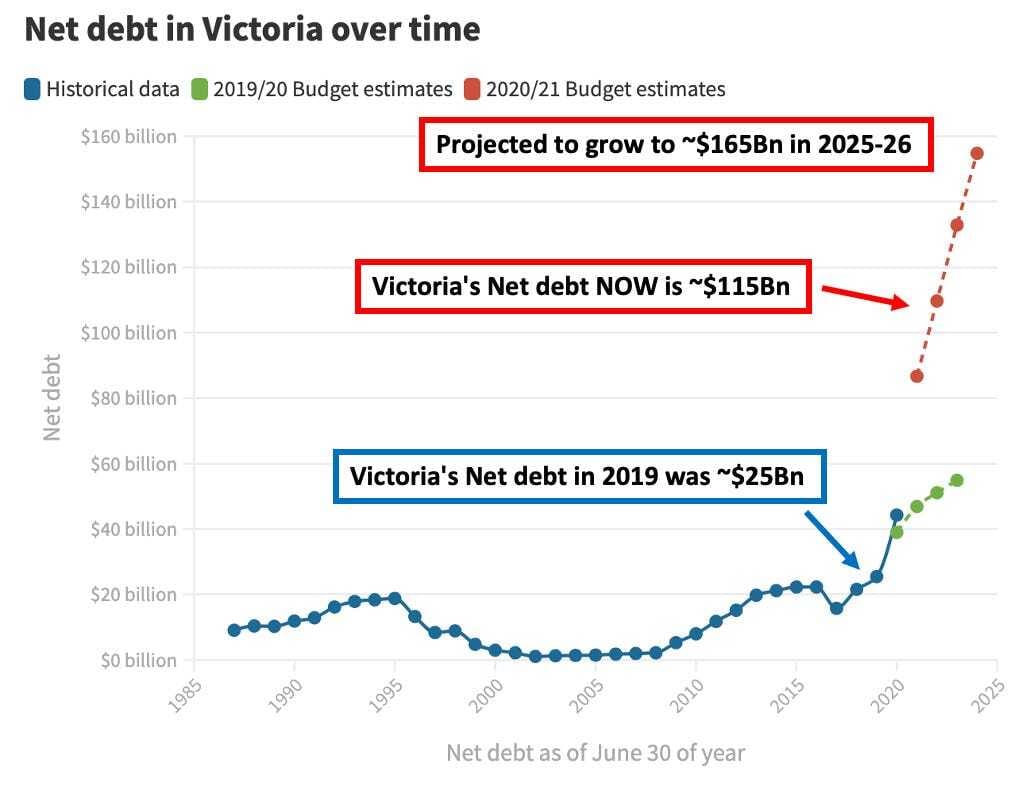Over the last ~4 years, Victoria’s state debt has ballooned by almost 500% to all-time highs of ~$115Bn and is expected to reach ~$165Bn by 2025-26.