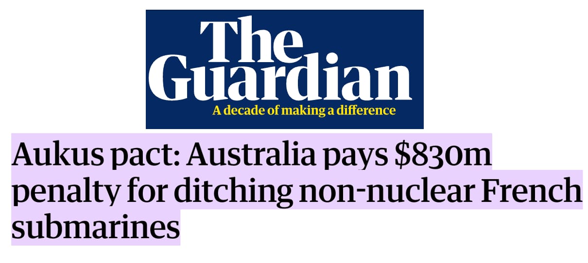 Football stadiums aside, the government tore up a nuclear submarine contract with the French and had to pay $830M in penalties only to go and sign another deal with a long-term cost of $368Bn.
