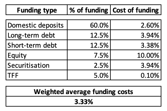 (1) Funding costs 3.33% + (2) Net interest margin 2.25% = (3) Mortgage rate offered to new borrowers is 5.58%.