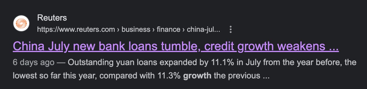 Domestic credit growth in China was down to the lowest level in seven months in July, while broad credit growth dropped to a record low.