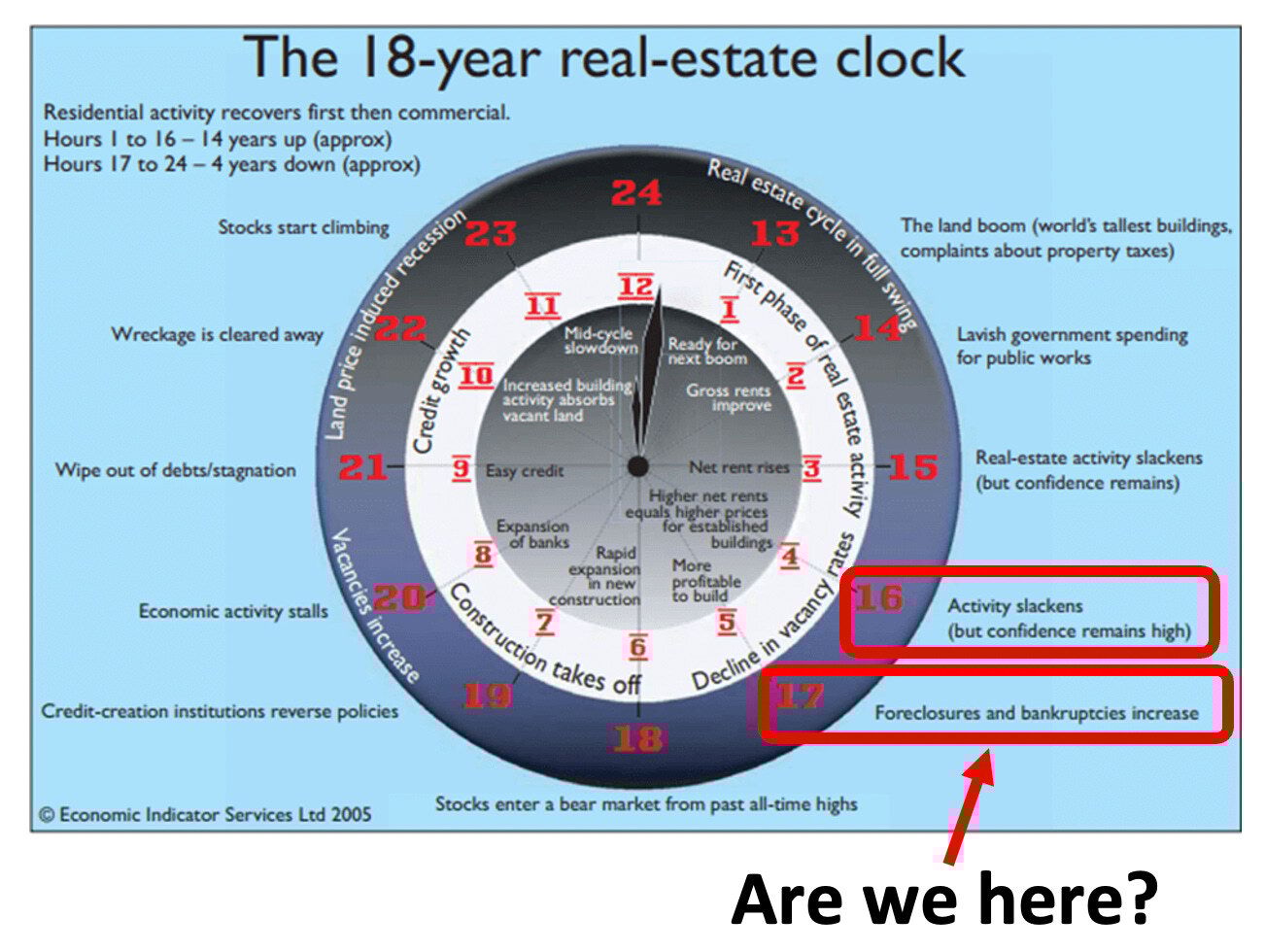Hour 17 (foreclosures and bankruptcies increasing) - over the past 12 months, bankruptcies have increased across the building and construction sector. We expect the next wave of bankruptcies to come from the overleveraged property developers. We think the market has just entered the four-year downturn phase….