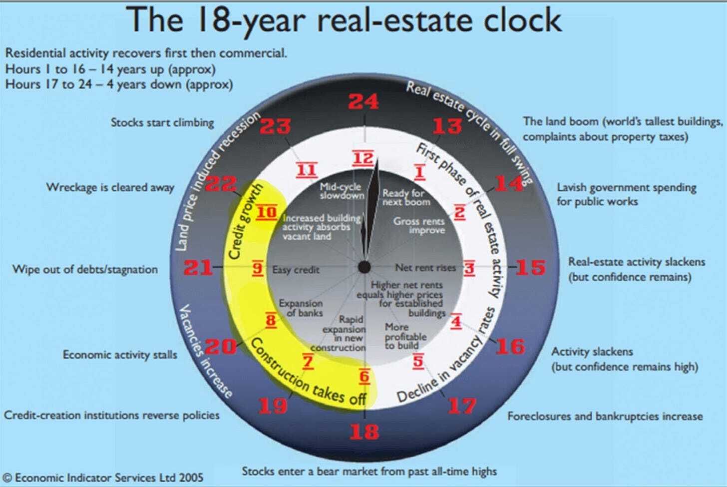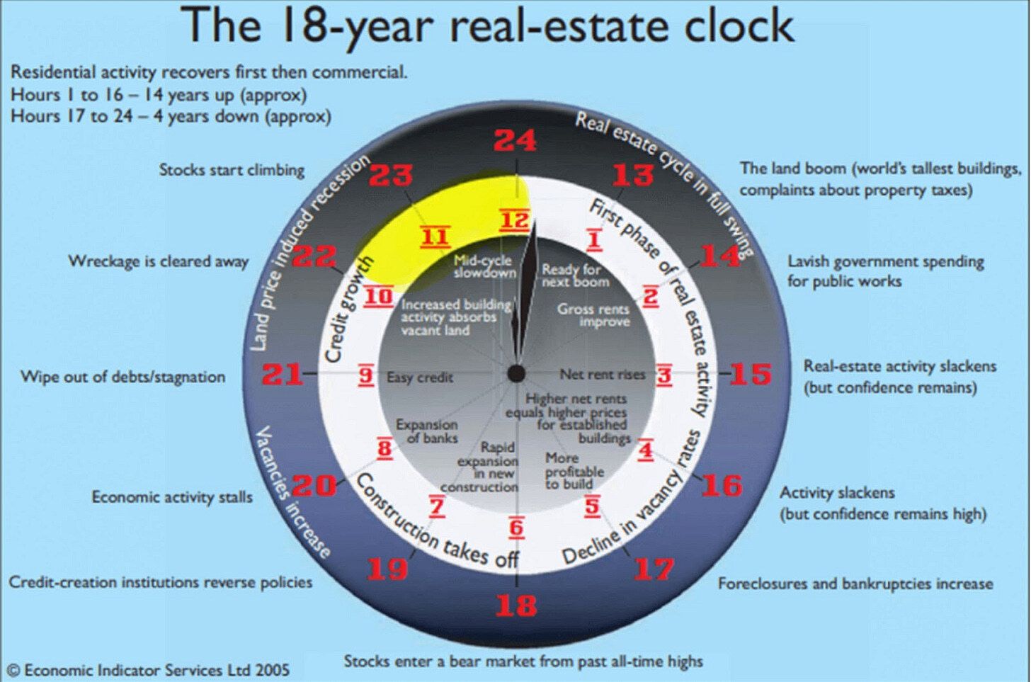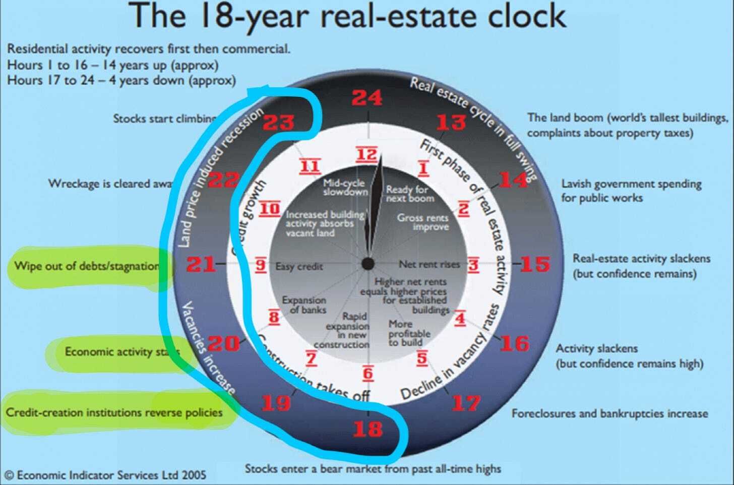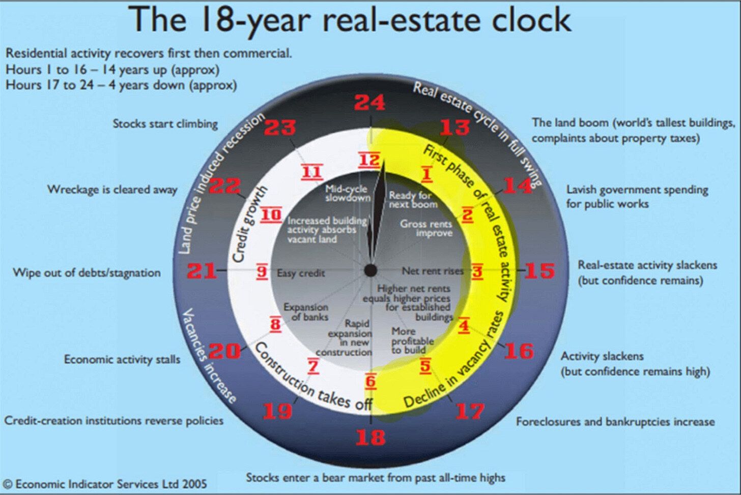 At a very high level, the clock shows an 18-year cycle (14 years up, 4 years down), split as follows: