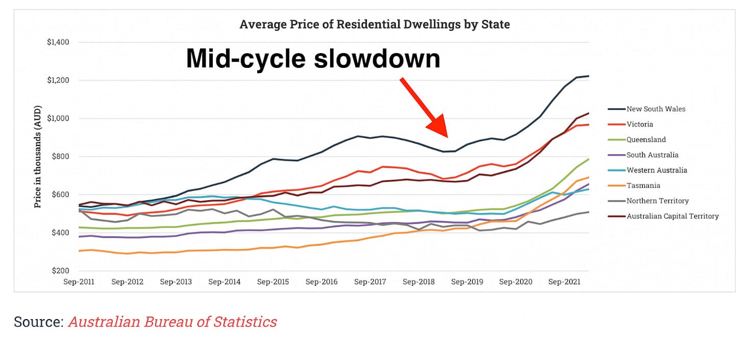 Hours 11 to 12 happened in 2019-2020 - the “mid-cycle slowdown” happened straight after that royal commission into lending. Everybody remembers how tough the market was getting by the end of 2019… the chart below shows how prices started to come down for a brief ~12 months.