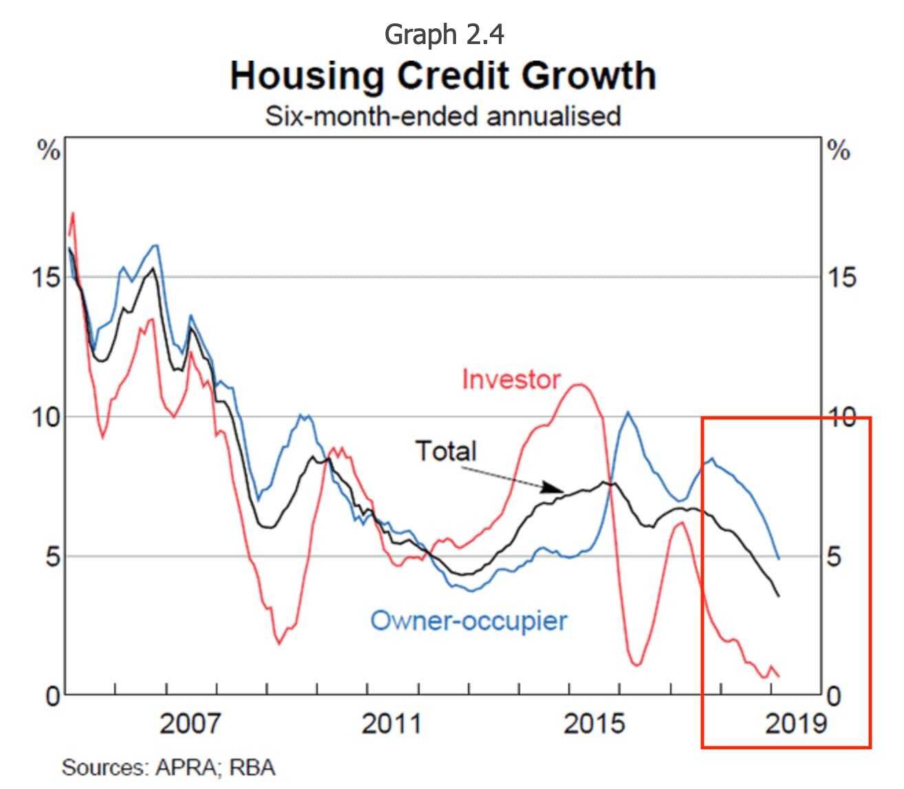 The chart below shows how property lending started to slow, with credit growth approaching 0% for investors and ~5% for owner-occupiers.